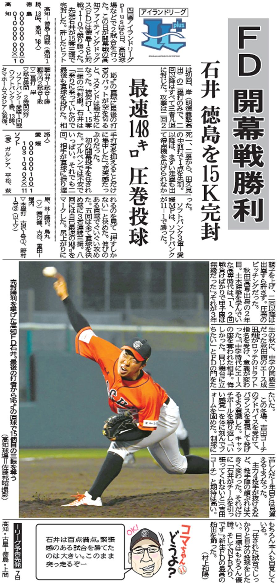 この開幕戦では自己最速の148キロをマーク。「任された試合でしっかりと自分の投球をしたい。目標はもちろん優勝。そしてNPB入り、です」。プロ野球選手になる目標はしっかりと高知のファンに届けることになる。