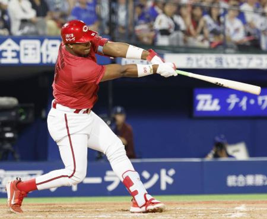 9回広島1死一塁、モンテロが左越えに決勝の2ランを放つ=横浜