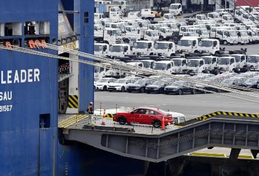 横浜港で船積みされる自動車=4月、横浜市