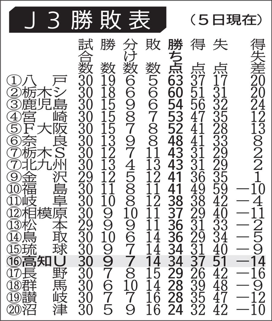 高知ユナイテッド、息詰まる熱戦を守備で制す!吉田決勝GでJ3残留へ大きく前進 気になるJFLは...【第34節・AC長野パルセイロ戦】