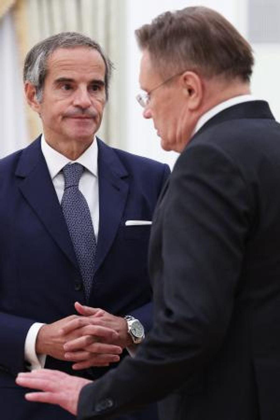 ロシア国営原子力企業ロスアトムのリハチョフ総裁(右)と話すIAEAのグロッシ事務局長=9月25日、モスクワ(AP=共同)