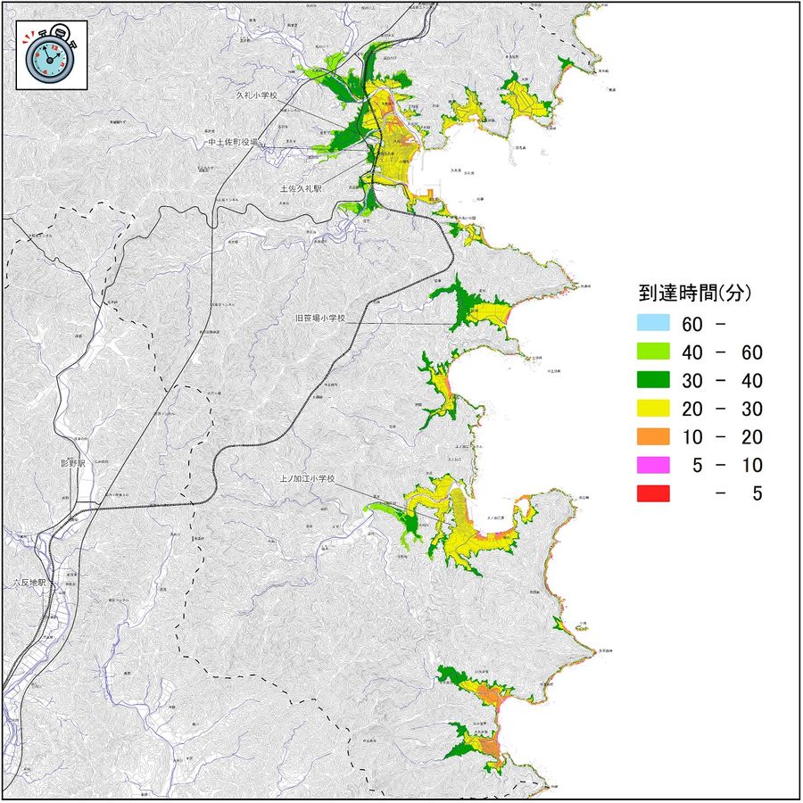 津波に足を取られ、避難行動が難しくなる30センチの浸水深となるのは、久礼川沿いや押岡、上ノ加江、矢井賀などの沿岸部で発生から10~20分。沿岸集落の広範囲が20~30分と予測されている。