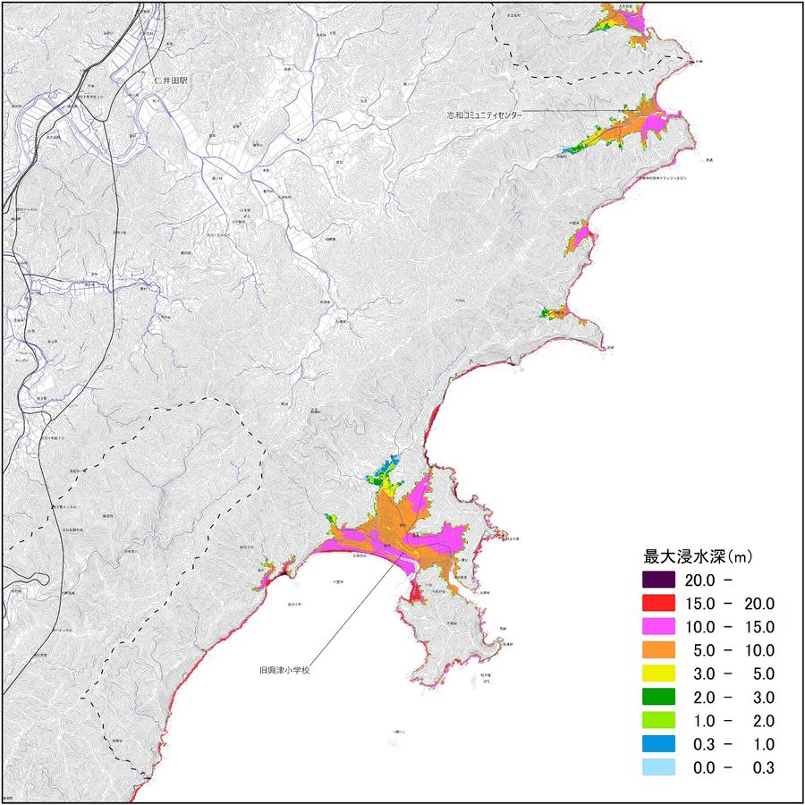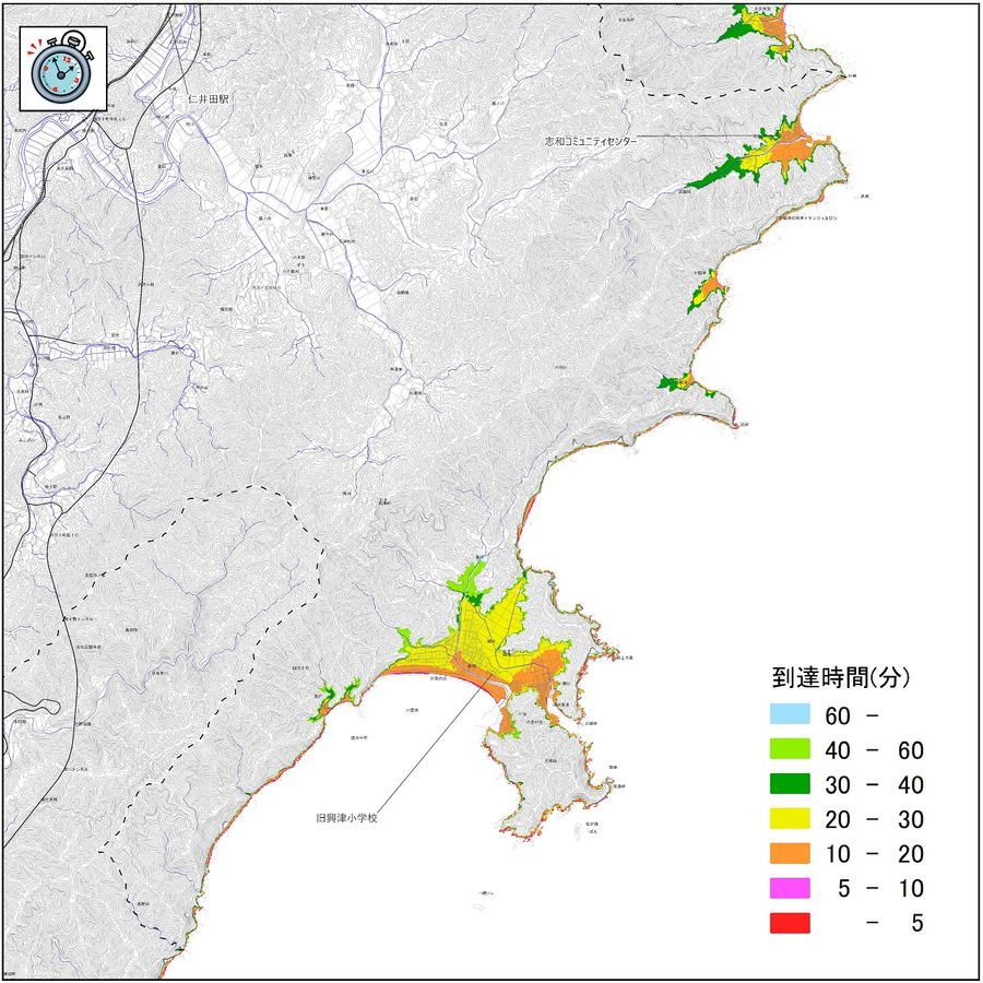 津波に足を取られ、避難行動が難しくなる30センチの浸水深となるのは、興津、志和の海岸近くや河川沿いが発生から10~20分。民家がある平野部も、広い範囲で20~30分と予測されている。