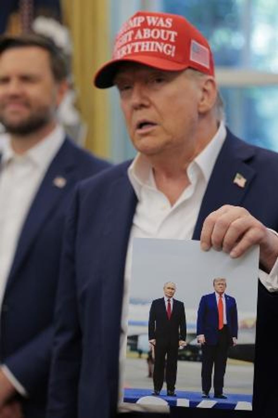 ロシアのプーチン大統領と一緒に米アラスカ州で撮影された写真を手にするトランプ大統領=8月22日、ワシントン(ゲッティ=共同)