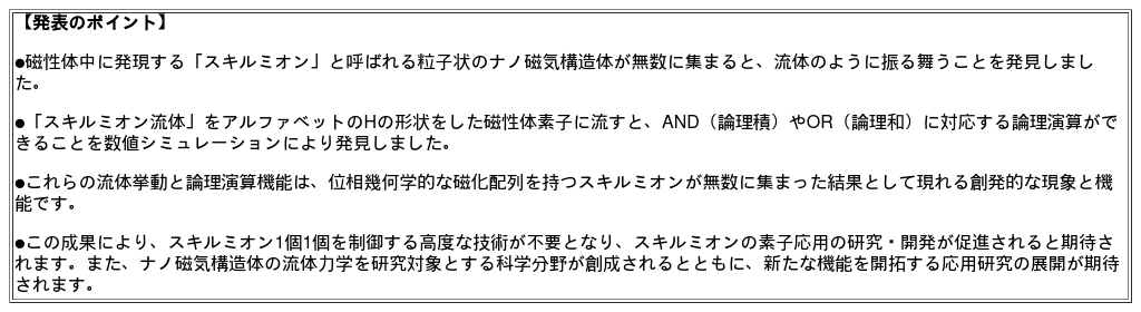 キーワード:スキルミオン、ナノ磁気構造体、スキルミオン流体、流体力学、論理演算、論理ゲート
