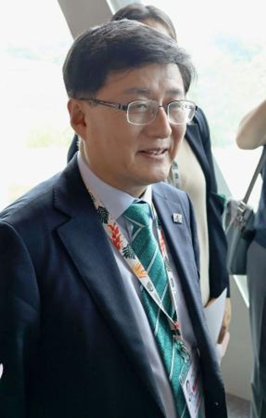COP30の会合に出席後、報道陣の取材に応じる韓国の金星煥環境相=17日、ブラジル・ベレン(共同)