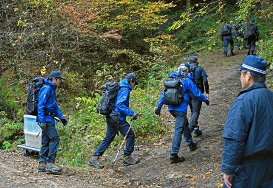 小型航空機墜落事故の現場に向かう運輸安全委員会の航空事故調査官ら=20日午前、福岡県八女市