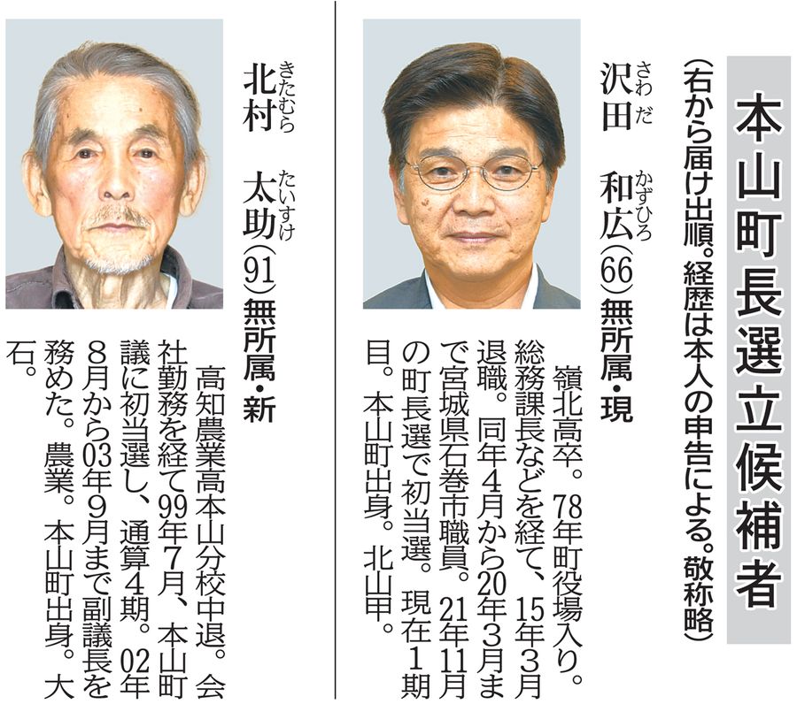 現新2氏支持呼びかけ 本山町長選11/30投票