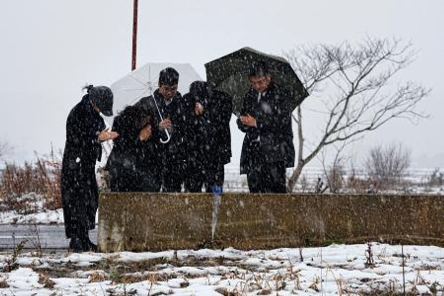 能登半島地震で犠牲になった親族の自宅跡で手を合わせる人たち=1日午後1時58分、石川県珠洲市宝立町
