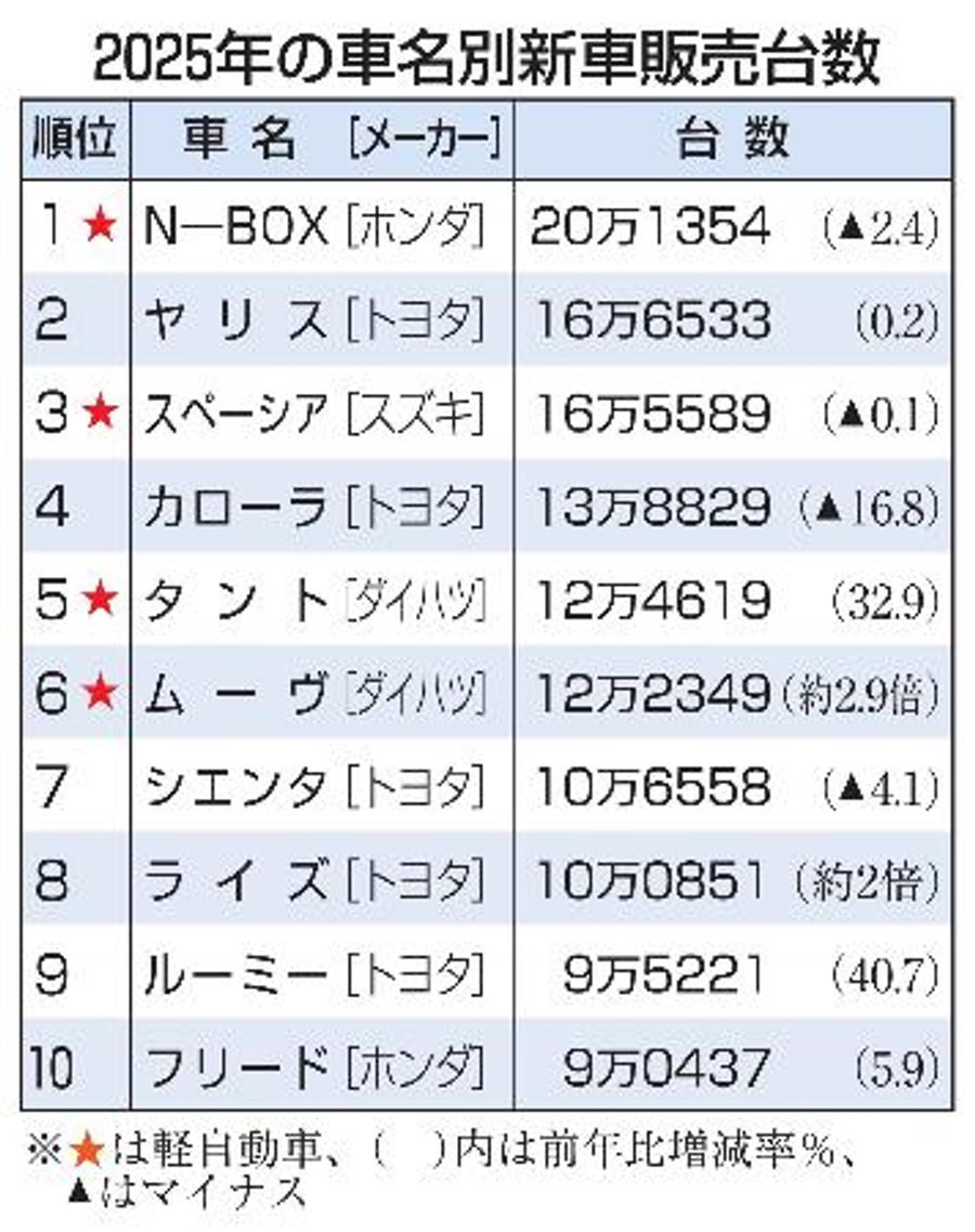 2025年の車名別国内新車販売台数は、ホンダの軽自動車「N―BOX(エヌボックス)」が20万1354台で前年より2・4%減ったものの、4年連続の首位となった。高い安全性能や広い車内スペースが支持を集めている。日本自動車販売協会連合会と全国軽自動車協会連合会が8日発表した。