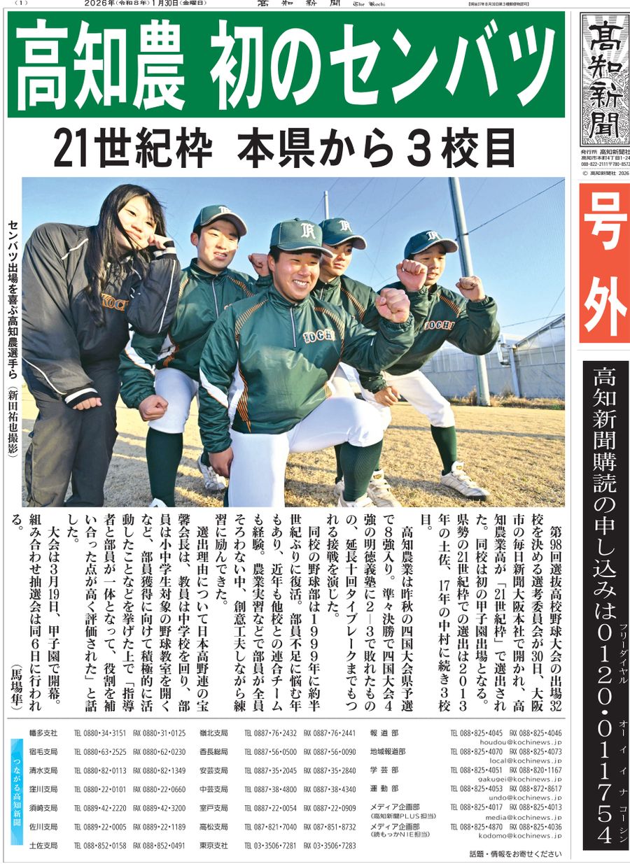 【電子号外】高知農が初のセンバツ 21世紀枠 高知県から3校目