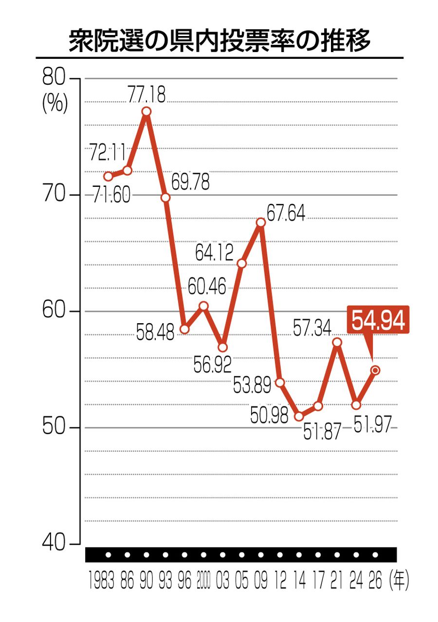 男女別の県内投票率は男性54・21%、女性55・59%。当日有権者数(在外登録者を含む)は56万4965人で、1区29万6651人、2区26万8314人だった。(横山仁美)