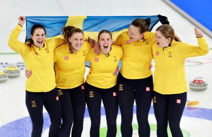 スイスを破って金メダルを獲得し、歓喜するハッセルボリ(左端)らスウェーデンチーム=コルティナダンペッツォ(共同)